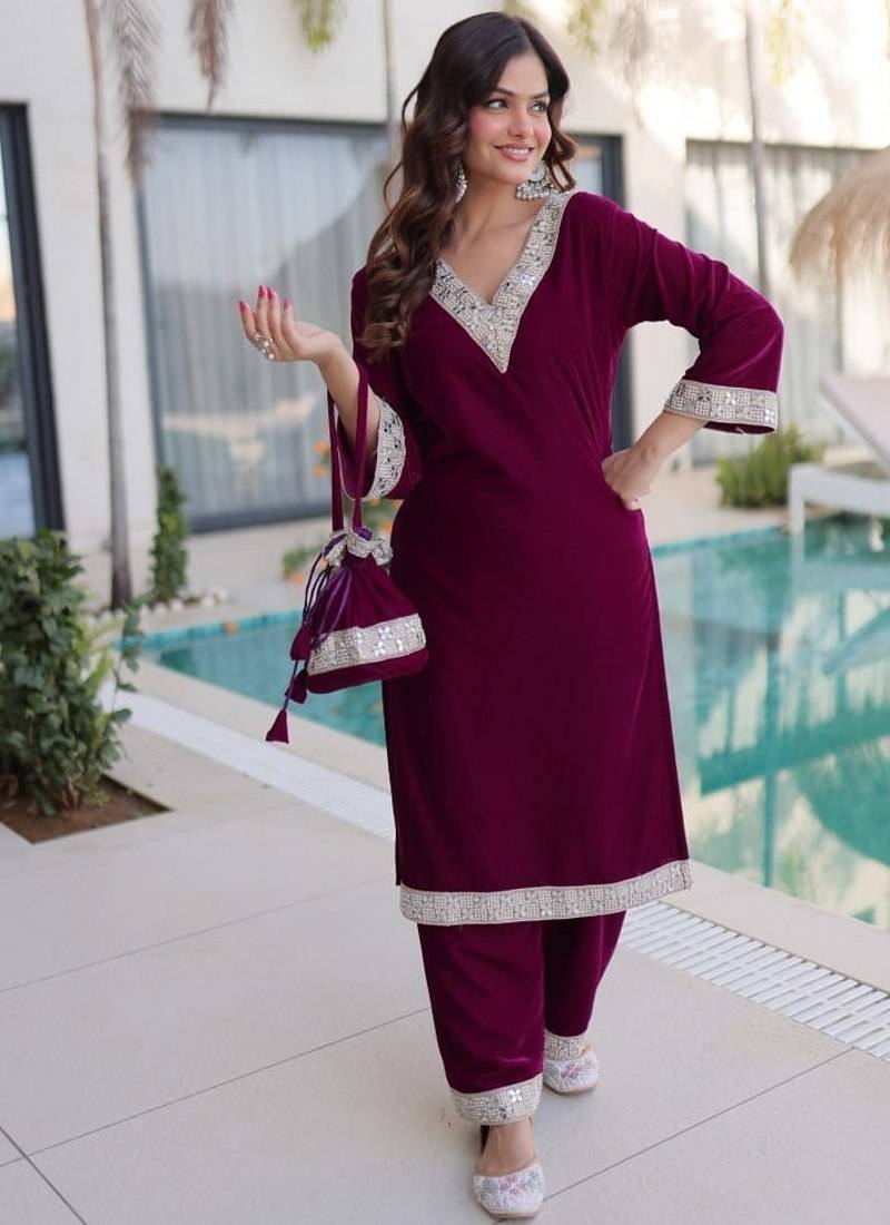 • Product Id : 4685307 • Package Details : 1 Kurti / 1 Palazzo / 1 Batwa • Type : Kurta Sets • Fabric : Velvet • Work : Embroidered • Type : Mirror Work • Sleeve : Full Sleeve • Neck Style : V Neck • Color : Wine • Stitching : Stitched Payments [+]