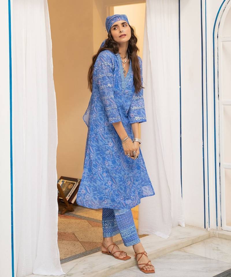• Product Id : 4713333 • Package Details : 1 Kurta / 1 Pant / 1 Dupatta • Type : Kurta Sets • Fabric : Cotton • Work : Printed • Type : Floral Print • Sleeve : Half Sleeve • Neck Style : Round Neck • Color : Blue • Stitching : Stitched • Length : 40.0 Payments [+]