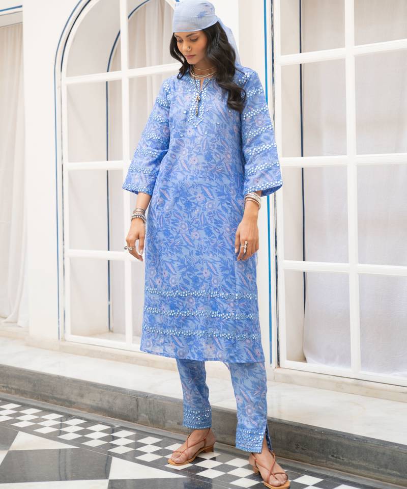 Blue Floral Embroidered Pure Cotton Kurta Set With Dupatta