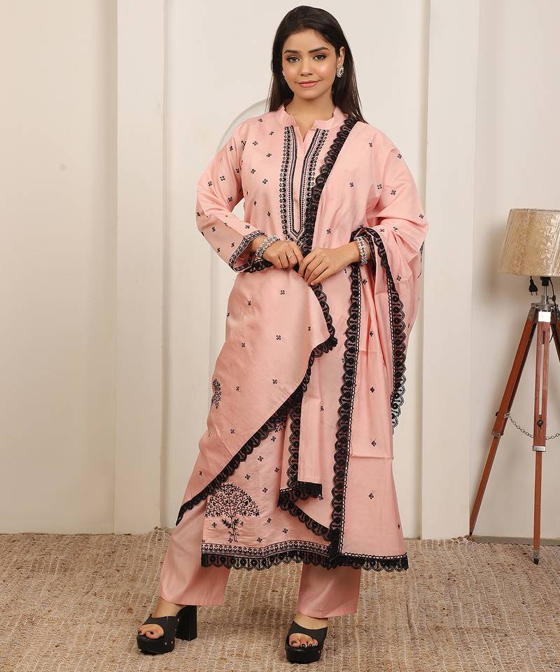Peach Embroidery Work Cotton Blend Kurta Trousers With Dupatta. Stitched