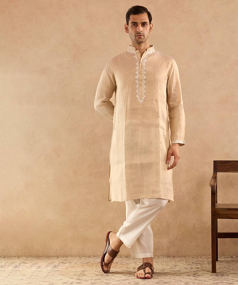 This Beige Embroidered Tissue Kurta Set Features A Finely Embroidered Kurta Paired With A Coordinated Bottom For A Complete Festive Ensemble. Crafted From Soft Tissue Fabric, It Provides Graceful Movement And Comfort. Ideal For Weddings, Festive Functions, And Cultural Celebrations With Elegant Ethnic Appeal.