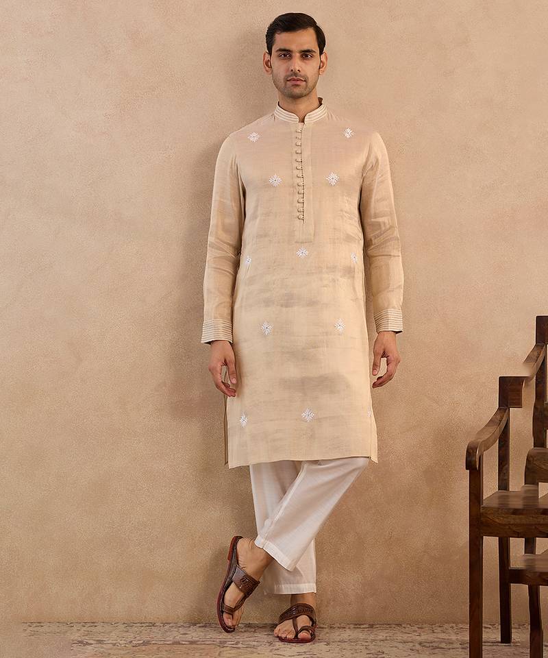 Elegant And Refined, This Beige Embroidered Tissue Kurta Set Showcases Delicate Embroidery On Lustrous Tissue Fabric. The Coordinated Kurta And Bottom Create A Polished Traditional Look. Perfect For Festive Gatherings, Weddings, And Special Occasions, This Set Blends Comfort With Understated Royal Charm.