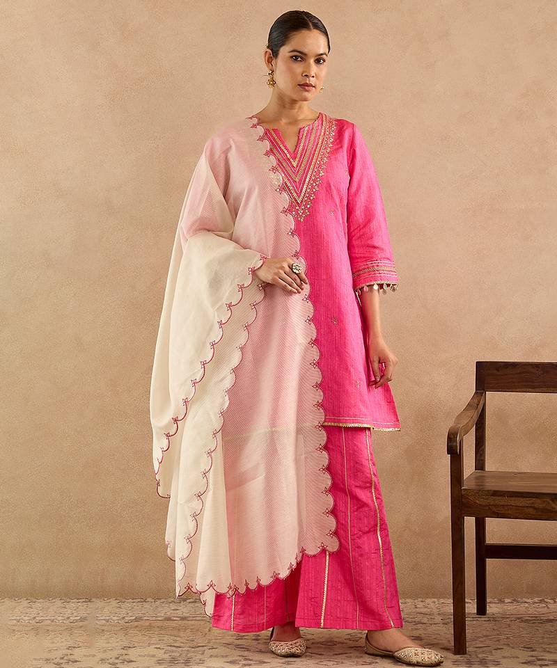The Pink Embroidered Raw Silk Kurta Set Showcases Rich Texture And Festive Elegance. Crafted From Premium Raw Silk Fabric, It Features Detailed Embroidery For A Refined Ethnic Appeal. Paired With A Matching Bottom And Dupatta, This Set Is Ideal For Weddings, Festive Occasions, And Special Celebrations.