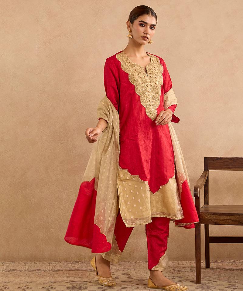 Red Embroidered Raw Silk Kurta Set