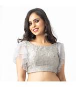 Niharikaa contemporary shimmer net ruffle sleeved padded grey boat neck blouse with champagne gold zari embroidery on dupion silk. Heart shaped open back with hook eye closure at neck and waist. Can be worn with any bottomwear for that awesome fusion look. Accessories Used In The Blouse Like Lace, Latkans And Threads May Differ As Per Availability. Our blouses Have Built In Margin Of 1 Inch. Actual Colors May Slightly Vary Due To Photographic Effects. Dry Clean Only.