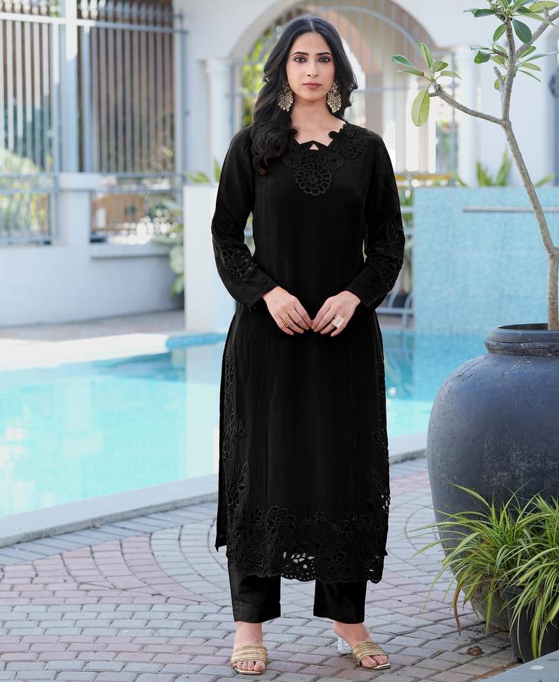 Black Art Silk Kurta With Intricate Cutwork Embroidery On The Neckline, Sleeves, And Hem, And Scalloped Lace Detailing Along The Front Slit. Matching Black Pants That Are Straight-Cut And Reach The Ankles.