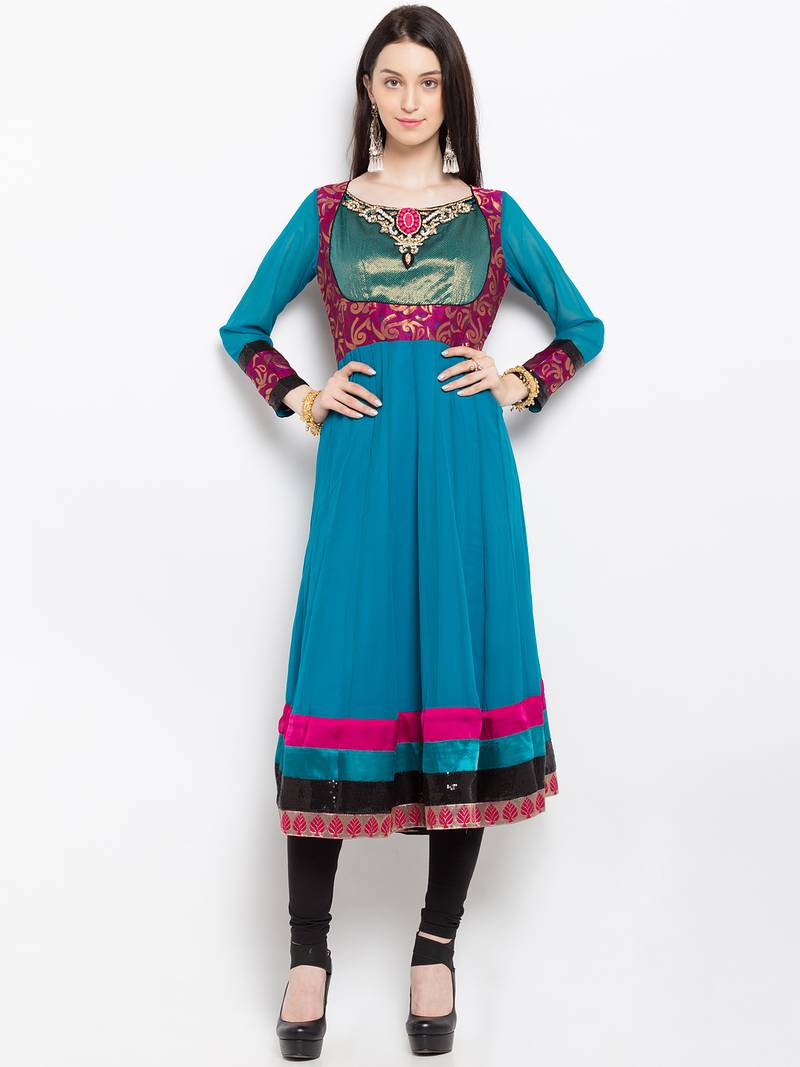 Blue Georgette Kalidar With Two Colour Brocade Yoke And Hand Embroidery On Neckline With Satin Sequence Brocade Border In Hemline Worn With Black Churidar