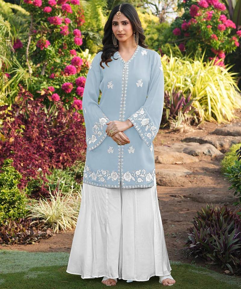 Light Blue Embroidered Modal Satin Straight Cut Kurta Kalidar Palazzo Set
