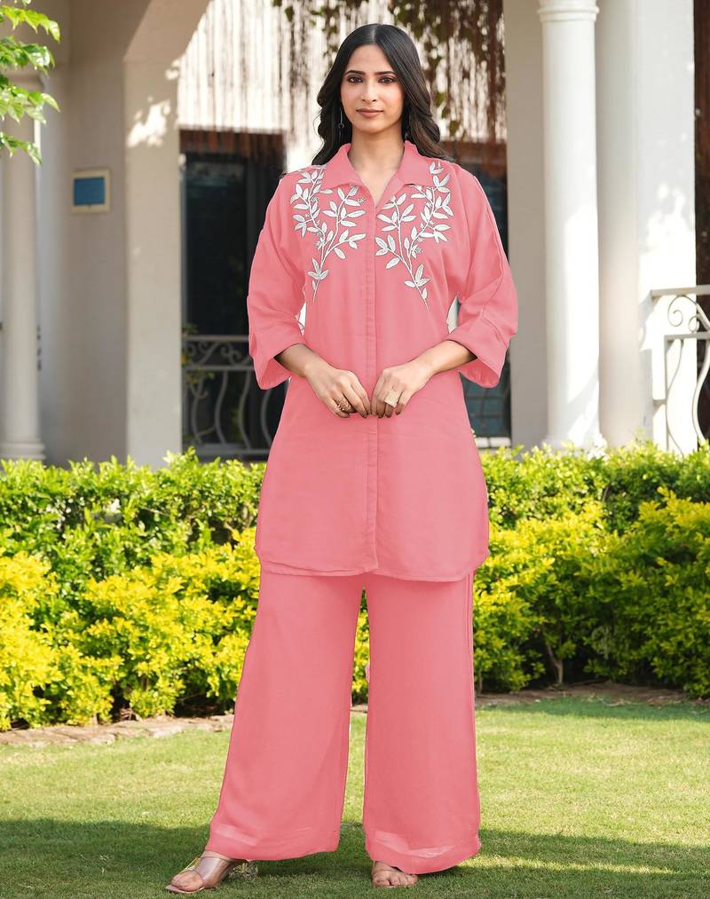 light-pink Viscose Georgette Kurta-Style Shirt With White Embroidered Floral Vines On The Neckline And Chest Area.