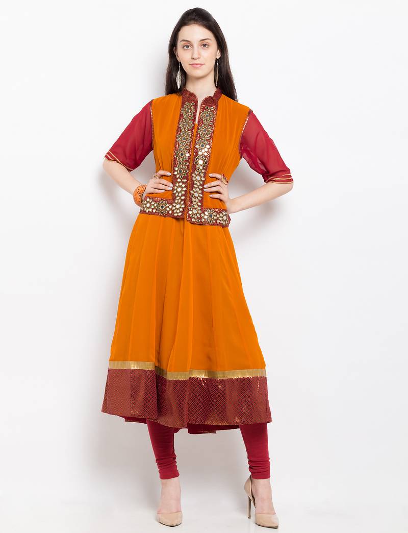 Orange Embroidered Georgette A Line Kurta Churidar Set