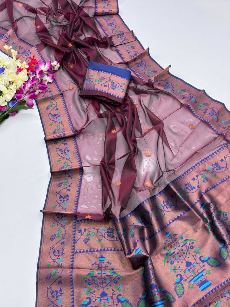 Brown Color Tissue Art Silk Saree With Contrast Blouse