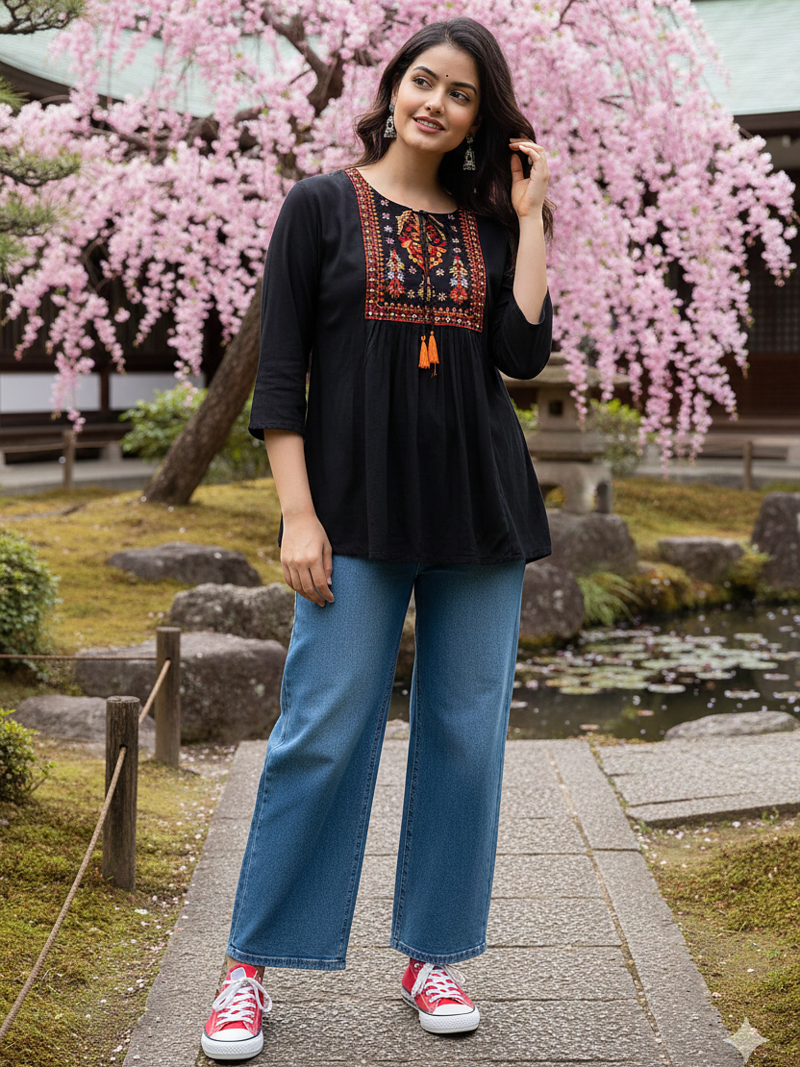 This Vibrant Top Is A Perfect Example Of Ethno Western Fusion, Blending Traditional Indian Craftsmanship With A Contemporary Silhouette. Elevate Your Everyday Style With Our Black Ember Embroidered Top, A Stunning Tribute To Indian Heritage Reimagined For The Modern Wardrobe. This Burnt Black Tunic Features Intricate Hand Embroidery Inspired By The Timeless Floral Motifs Of Kashmiri And Phulkari Traditions. Crafted By Skilled Indian Artisans, The Multi Colored Thread Work Creates A Focal Point At The Yoke, Making It A True Piece Of Wearable Art. Shop The Black Ember Embroidered Tunic—A Masterpiece Of Indian Artisan Embroidery Meets Western Boho Style. Featuring Intricate Floral Thread Work, A Tassel Tie Neck, And A Flattering A Line Fit. Perfect For Casual Outings Or Festive Fusion Looks. Handcrafted. Authentic. Timeless.