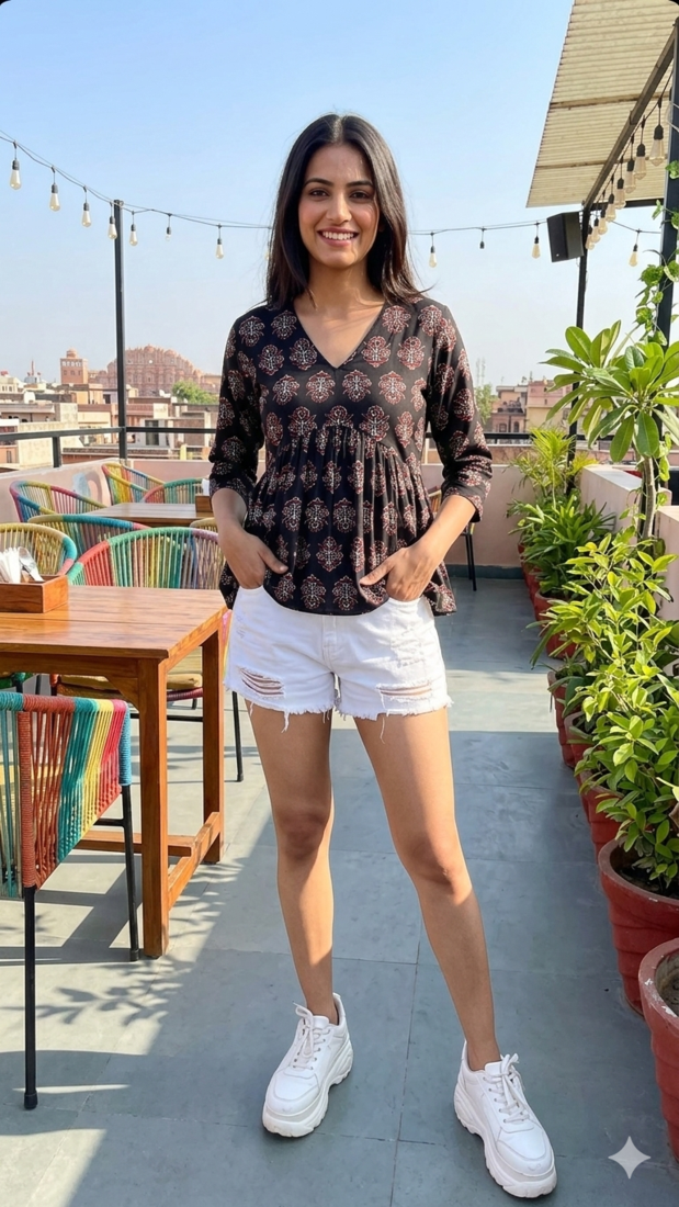 The "Jaipur Explorer" (Indo-Western):Swap the shorts for white flared palazzos or straight-fit cotton trousers.