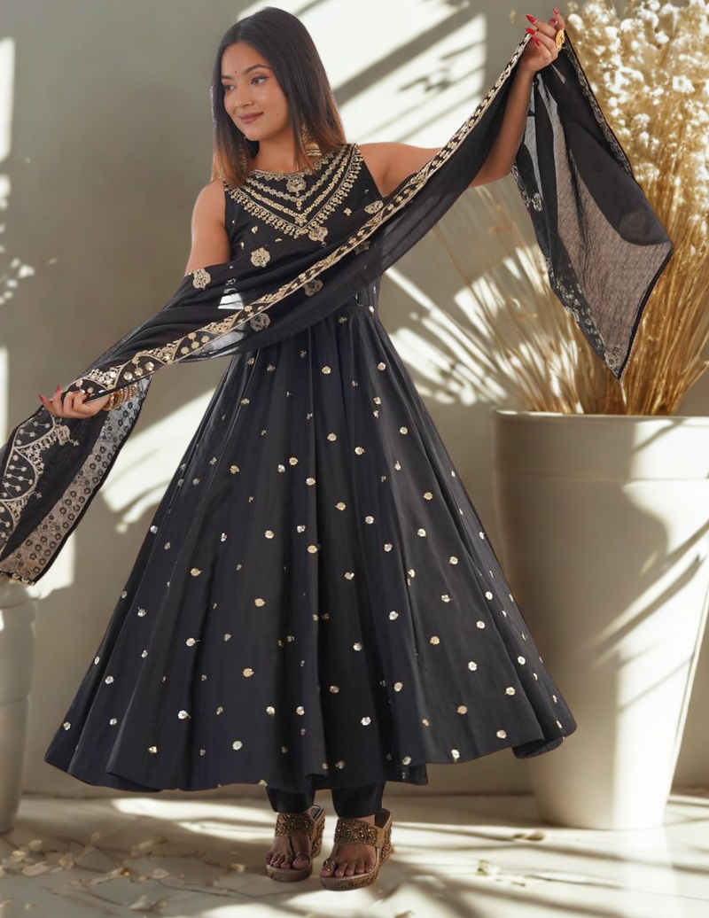 * *Length :-* 2.10 meter• Product Id : 4754680 • Package Details : 1anarkali/1pent/1 Dupatta • Type : Kurtis • Occasion : Bridal • Fabric : Silk • Work : Embroidered • Type : Sequins Work • Look : Traditional • Sleeve : Sleeveless • Color : Black • Stitching : Stitched • Neck Style : Scoop Neck • Length : Gown Length 50 Approx, Bottom Lengh 40 Approx General - Color and Texture may have slight variation. This happens because of photography.