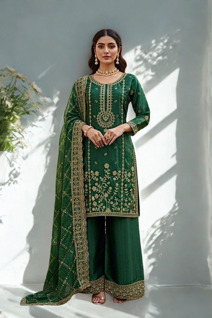 Green Silk Embroidered And Sequence Work Kurta Palazzo And Dupatta 3pc Set