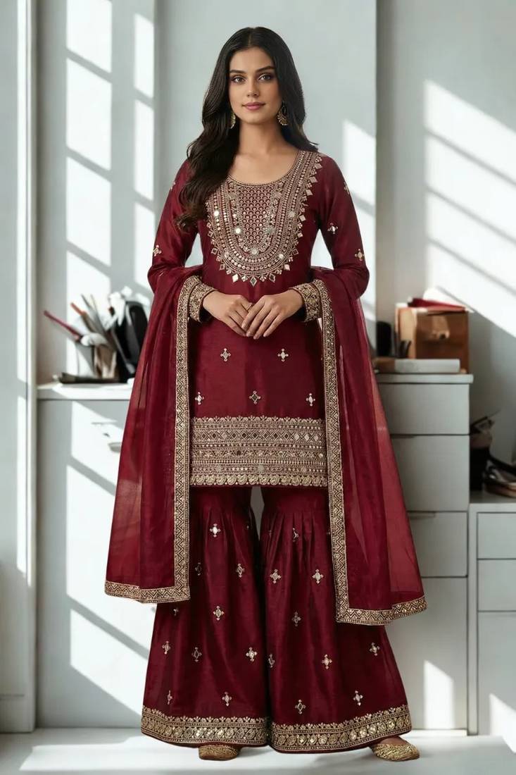 Maroon Silk Sequence Work Kurta Palazzo And Dupatta 3pc Set