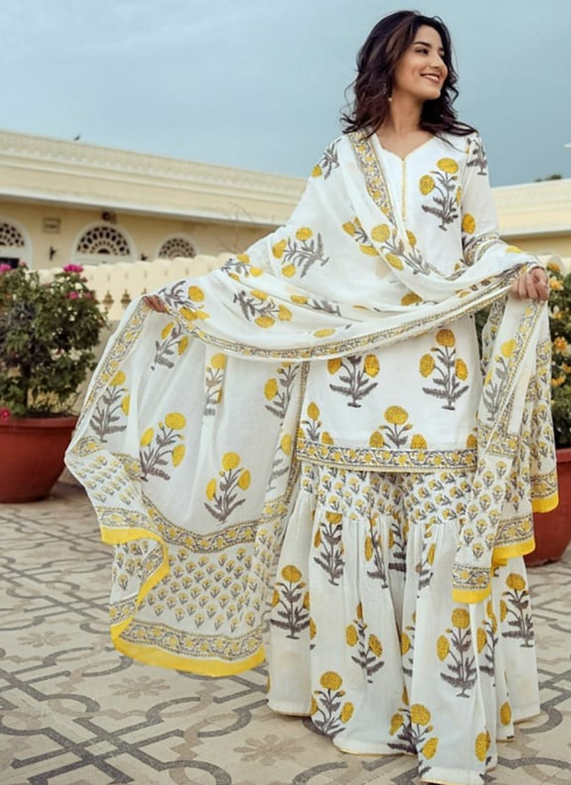 White Cotton Printed Short Kurta With Palazzo & Dupatta Set For Women