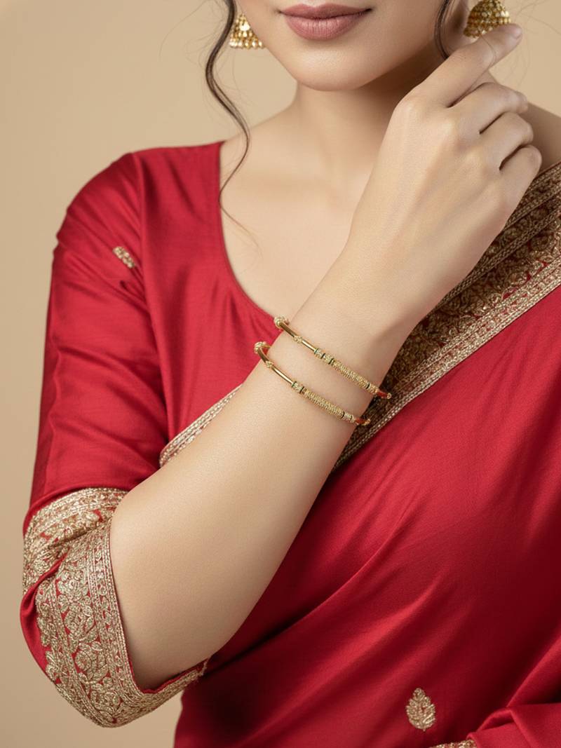 women set of 2 gold plated handcrafted traditional bangle enhance your ethnic charm with these beautifully crafted gold-tone designer bangles. featuring elegant bead accents in subtle tones, these bangles blend traditional artistry with contemporary style. the smooth metallic finish paired with detailed embellishments adds a graceful sparkle, making them perfect for festive celebrations, weddings, or special occasions. lightweight and comfortable, they can be worn as a stacked set for a rich, statement look or paired with other bangles for a personalized style. a timeless addition to any jewelry collection.