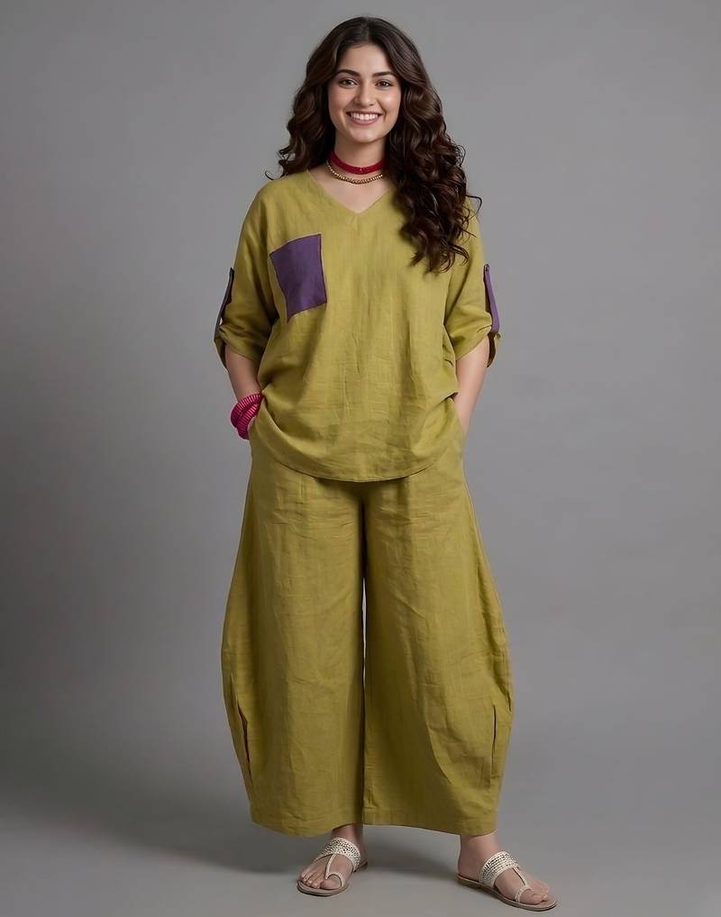Effortless style meets everyday comfort in this relaxed olive co-ord set designed for modern, easy dressing. Crafted in breathable fabric, the set features a loose V-neck top with rolled-up sleeves and subtle contrast patch detailing that adds a playful touch to the minimalist silhouette. The wide-leg pants are designed for both comfort and character, featuring soft gathers and a distinctive side knot detail that adds shape and visual interest to the relaxed form. Functional pockets and the airy structure make it perfect for all-day wear. Whether styled for a casual day out, travel or relaxed gatherings, this ensemble blends comfort with understated elegance.