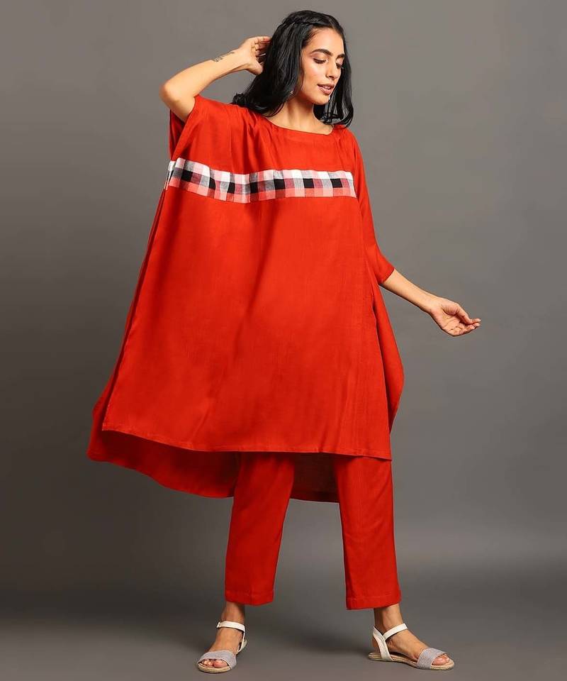 This vibrant two-piece set features a striking burnt orange kaftan-style top with a relaxed, flowing silhouette and a stylish high-low hem. The top is uniquely accented with a horizontal checkered pattern in black, white and orange across the chest. It is perfectly paired with comfortable straight-leg trousers in same colour, creating a cohesive and bold statement. This comfy yet eye-catching outfit is ideal for a chic and relaxed look.