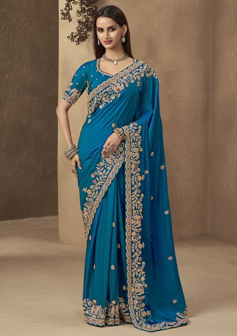 Dark Teal Embroidered Pramium Satin Saree With Designer Blouse Fabric