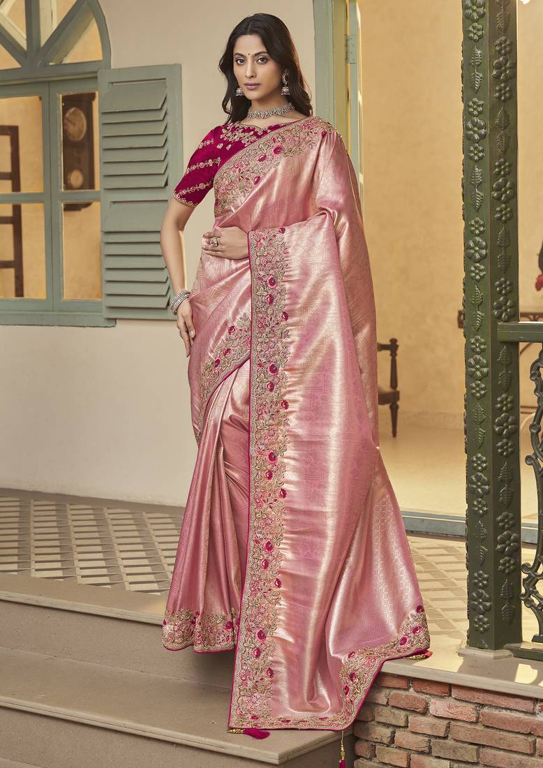 Gajri Pink Embroidered Jacquard Silk Blend Wedding Saree With Blouse Fabric
