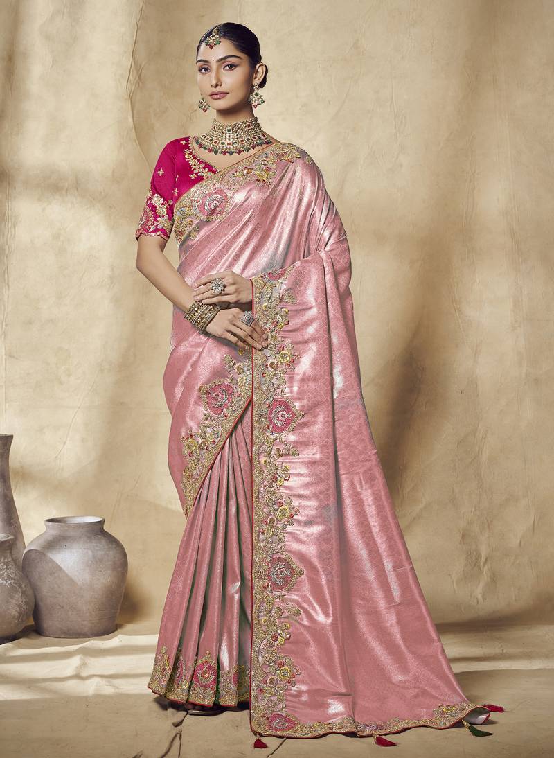Gajri Pink Embroidered Jacquard Silk Blend Wedding Saree With Blouse Fabric