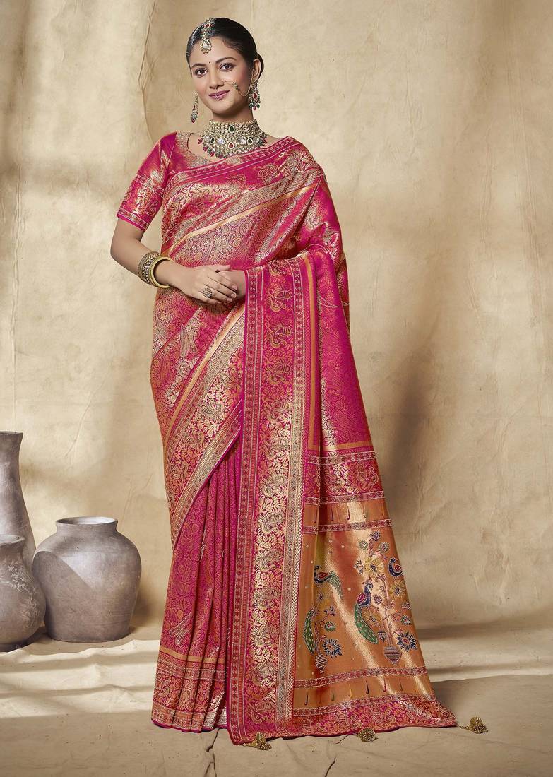 • Saree : Color- Rani Pink / Fabric- Silk Blend • Blouse : Color- Rani Pink / Fabric- Silk Blend Saree Details