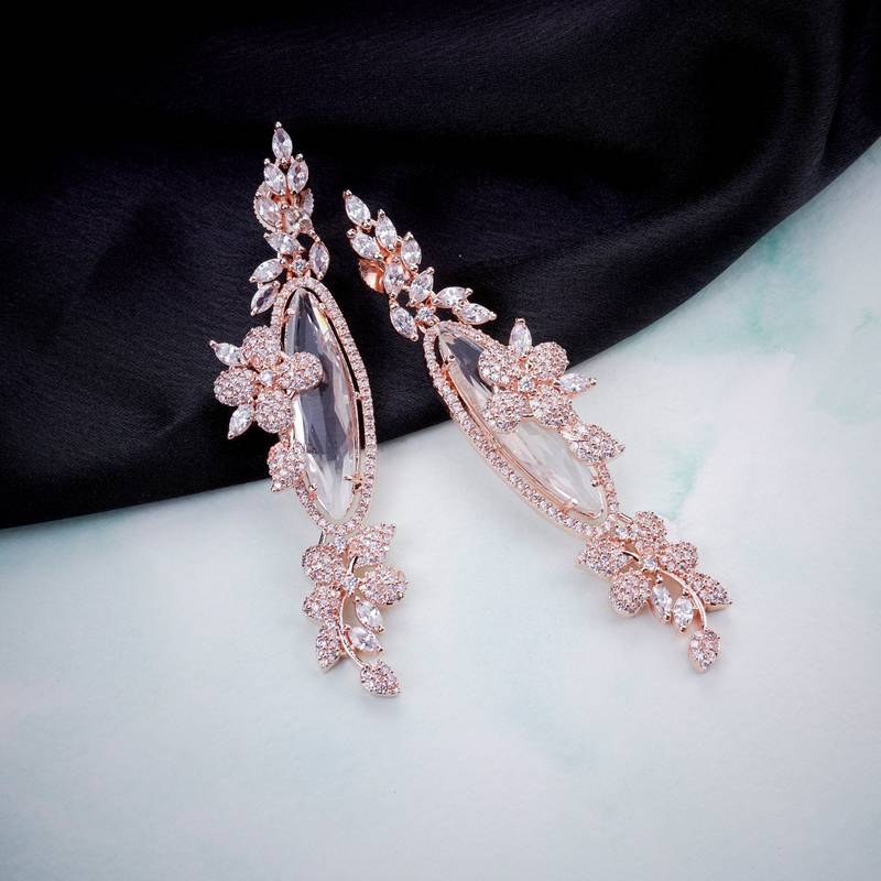 • Product Id : 4684443 • Package Details : 1 Earrings • Type : Earrings • Look : Contemporary • Jewellery Work : American Diamonds • Color : White • Plating : Rose Gold • Base Material : Brass • Piercing : Yes • Pearl Type : Na • Pearl Shape : Na Payments [+]