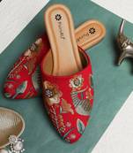 Pairs4u Women's Embroidered Red Canvas Juttis Ethnic Slip On Flats With Pvc Sole