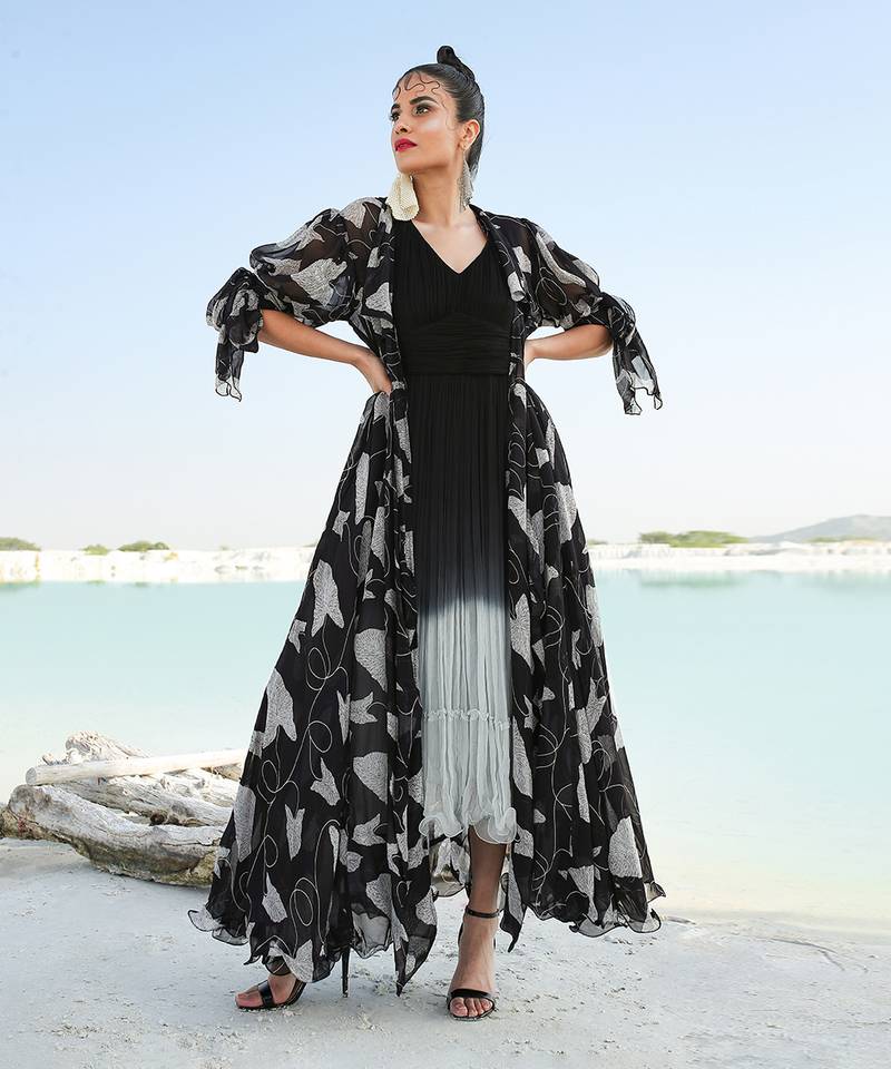 If you find the product for less we'll match it! Know MoreBlack to grey ombre dress paired with a black & white palm grove printed organza jacket.