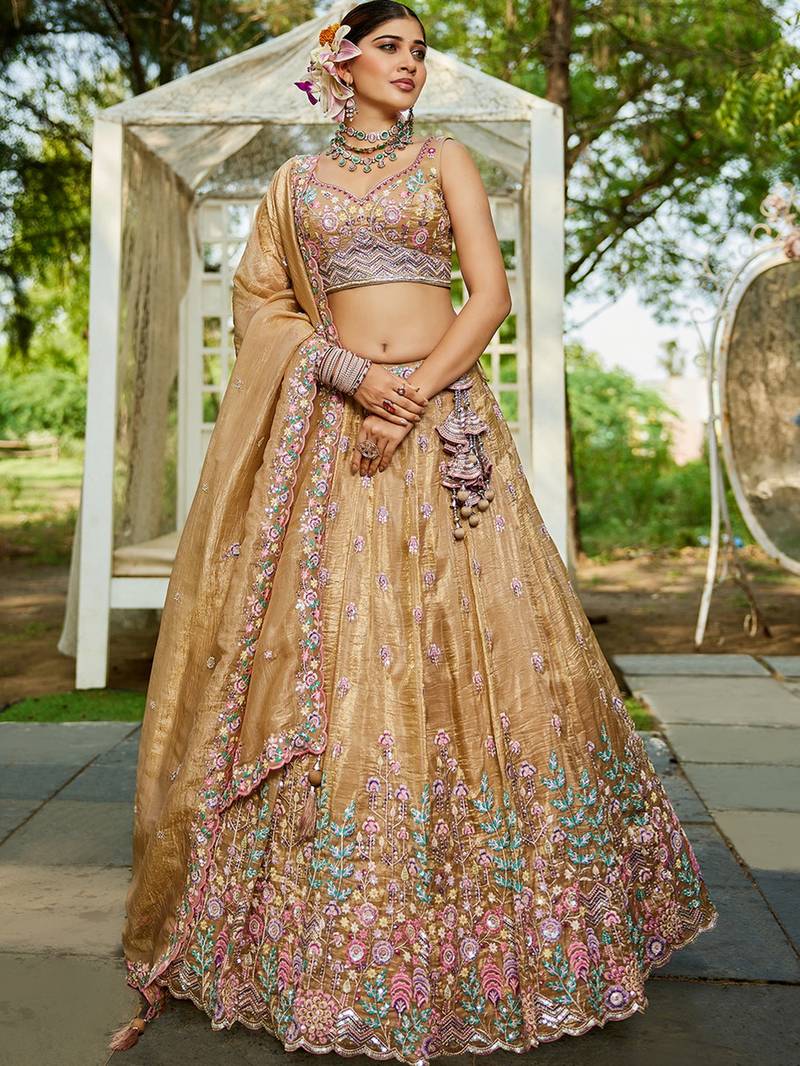 • Fabric : Tissue • Work : Embroidered • Color : Beige • Length : 2.5 Lehenga Details