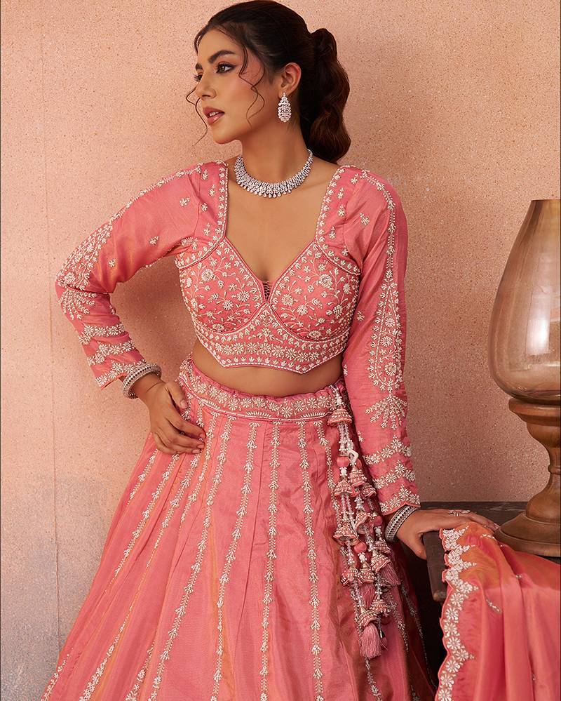 • Lehenga : Elegant semi-stitched lehenga set crafted in premium Peach Tissue fabric, heavy beads and sequence floral Embroidery work. The lehenga features a 3.5 meter flair with a cut work heavy border on the hemline and is supported with double shantoon inner, can-can 12 & 18 inches and buckram 4 and 12 inches for a perfect shape.