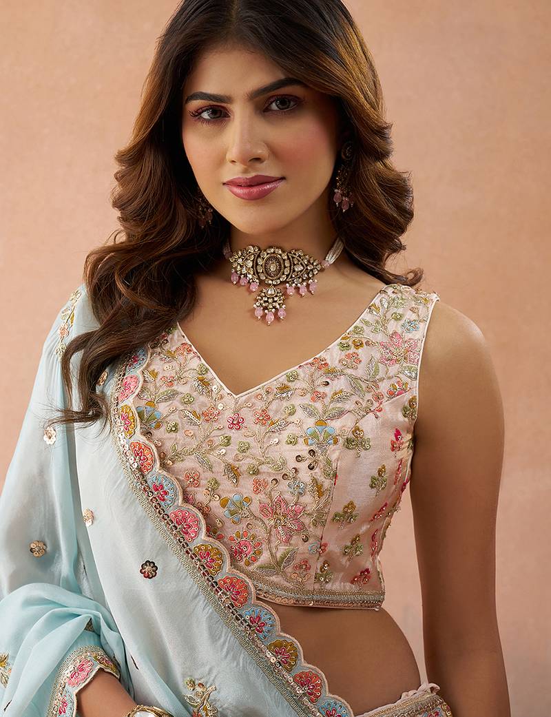 • Dupatta : Color- Sky Blue / Fabric- Tissue Lehenga Details