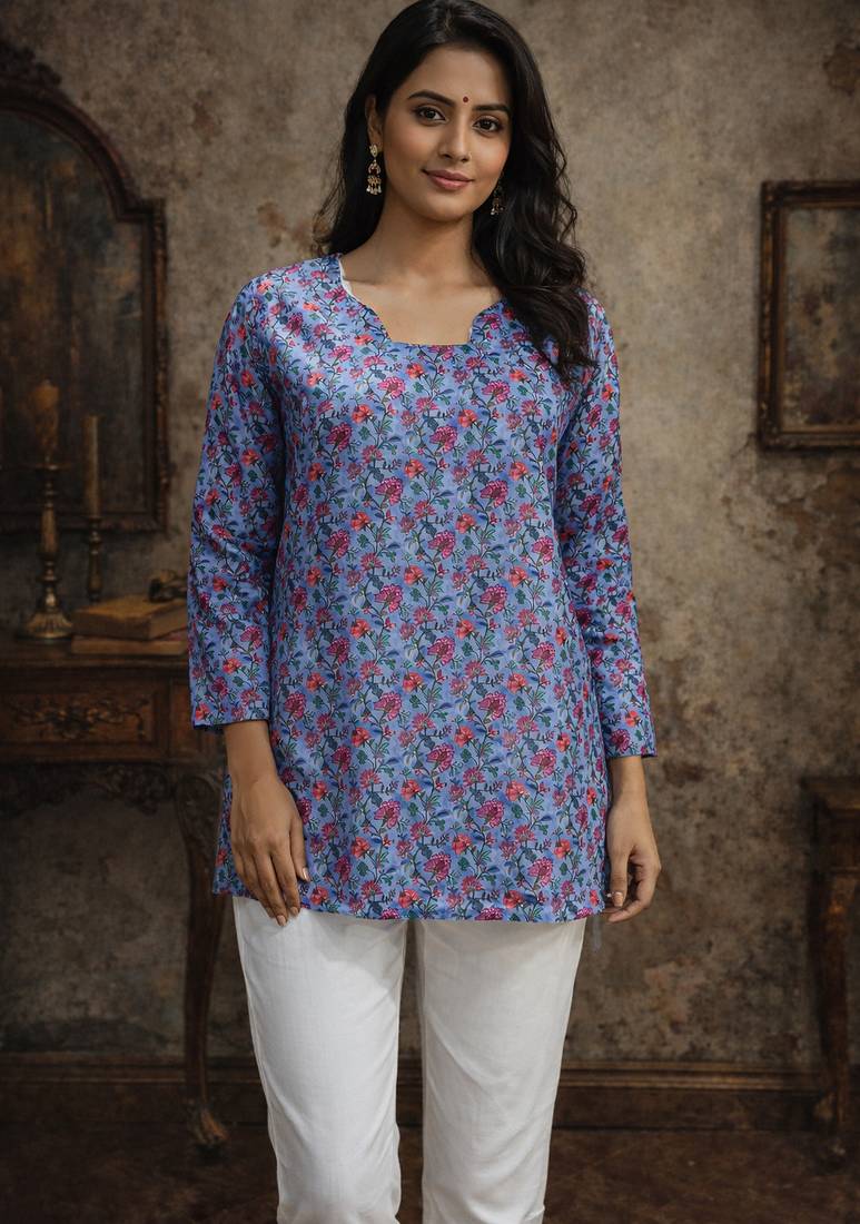 Trending Floral Digital Print Muslin Silk Tunic / Stylish Short Kurti For Grilish