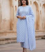 Sky Blue Cotton Polka Dot Printed Kurta Pant Dupatta Set for Women.