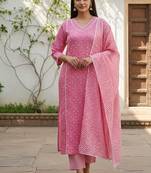 Women’s Rose Pink Cotton Printed Kurta Pant Dupatta Set