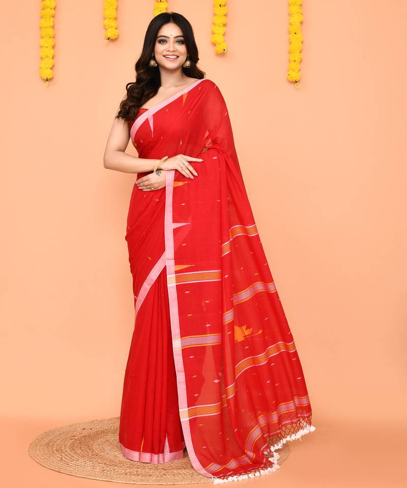 this red soft mul cotton jamdani saree features handwoven patterns throughout and is highlight with a contrast border and net tassels for added texture. the saree comes with a matching red cotton blouse piece, provided unstitched for a customized fit. the contrast pallu enhances the overall design, offering subtle depth and elegance. crafted from breathable cotton, this bengal handloom saree combines traditional jamdani weaving with lightweight comfort. ideal for casual gatherings, daytime events, or ethnic occasions, it showcases intricate handwoven work and versatile styling while maintaining a refined, designer look.