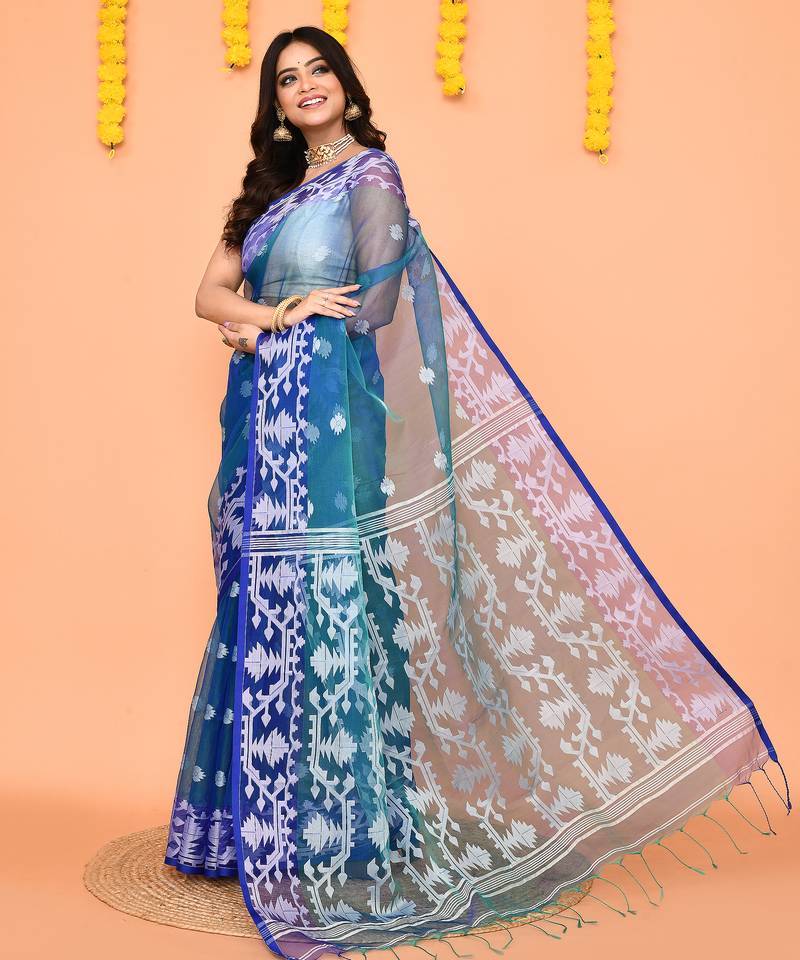 this blue resham silk jamdani saree features intricate handwoven designs paired with a contrasting pallu, represent traditional bengal weaving techniques. the unstitched silk blouse in matching blue allows a tailored fit, while the contrast border enhances the saree’s graceful drape. made from premium silk, it combines lightweight elegance with structured texture, suitable for ethnic occasions or casual gatherings. the detailed handwoven work highlights the artisanal craftsmanship of jamdani silk, offering a classic yet contemporary look for everyday ethnic wear.