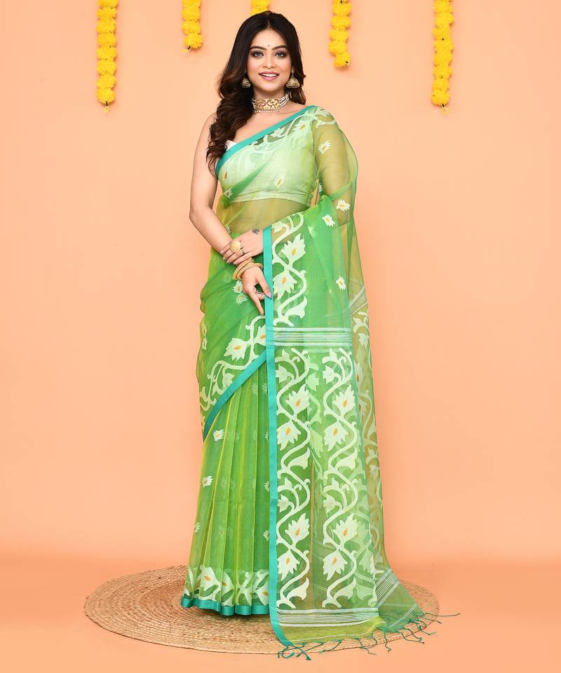 this green jamdani silk saree is crafted from premium silk fabric with handwoven resham detailing throughout the body. the saree features a contrast border and a designer pallu in complementary shades, adding texture and depth to the drape. the included lemon-colored silk blouse is handwoven to match the saree, provided in an unstitched format for a tailored fit. designed for ethnic and festive occasions, this saree combines traditional jamdani weaving techniques with contemporary designer appeal. lightweight and elegant, it highlights intricate handwoven patterns, a vibrant contrast border, and a refined silk finish, making it suitable for cultural gatherings, traditional events, and special occasions.