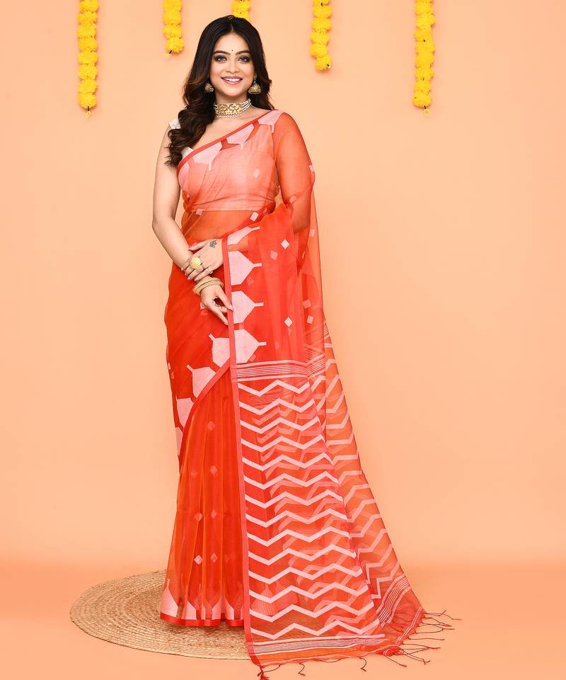 this orange resham silk jamdani saree showcases traditional handwoven motifs with a contrasting border and detailed pallu. crafted from premium silk, it drapes effortlessly, creating a graceful and elegant look. the saree includes an unstitched orange silk blouse piece with handwoven designs for a tailored fit. blending classic jamdani artistry with a vibrant hue, this ethnic saree is ideal for cultural gatherings, festive occasions, or designer-inspired ensembles. the intricate weave and refined texture reflect artisan craftsmanship and timeless elegance.