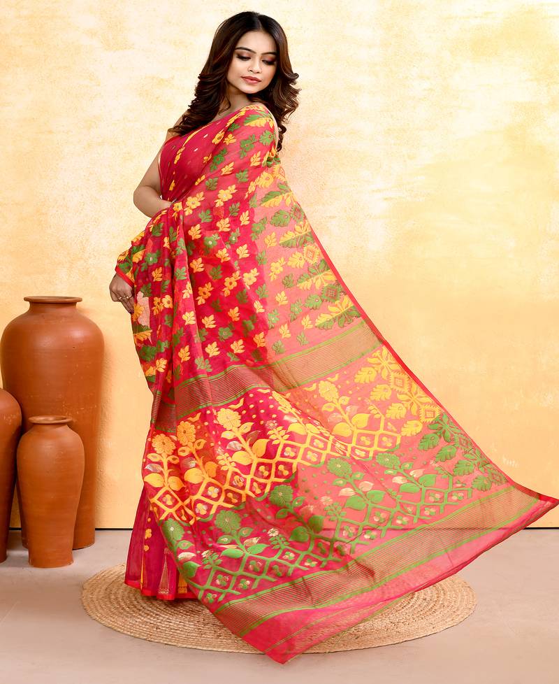 Women's Red Embellished Cotton Blend Jamdani Saree