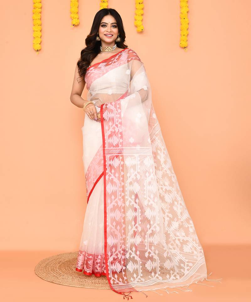 White Handwoven Jamdani Silk Saree With Contrast Pallu