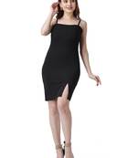 Popwings Women Casual Black Solid Bodycon Front Slit Mini Noodle Strap Dress