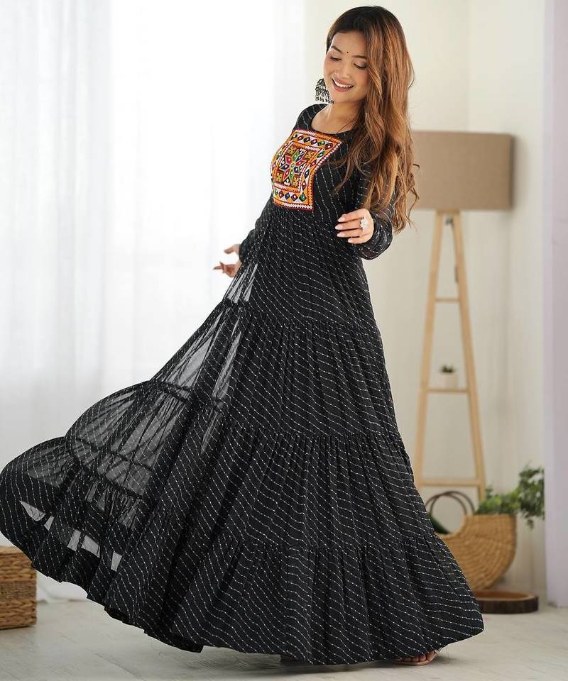 Black Color Lehariya Printed Faux Georgette Stitched Long Anarkali Gown
