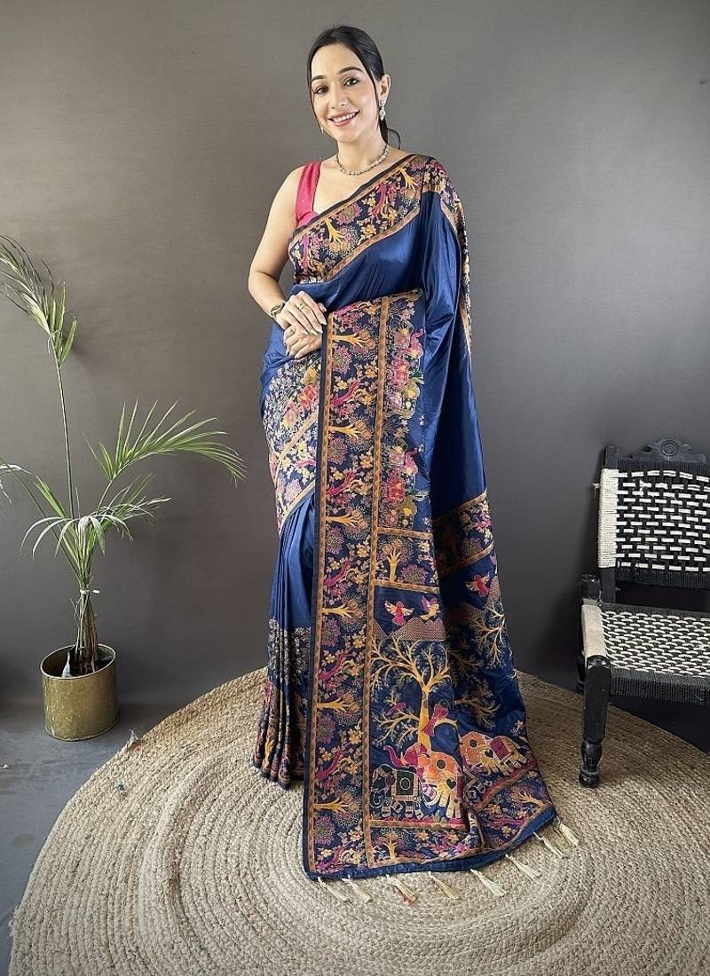 Blue Color Pashmina Kashmiri Meenakari Zari Weaving Work Saree