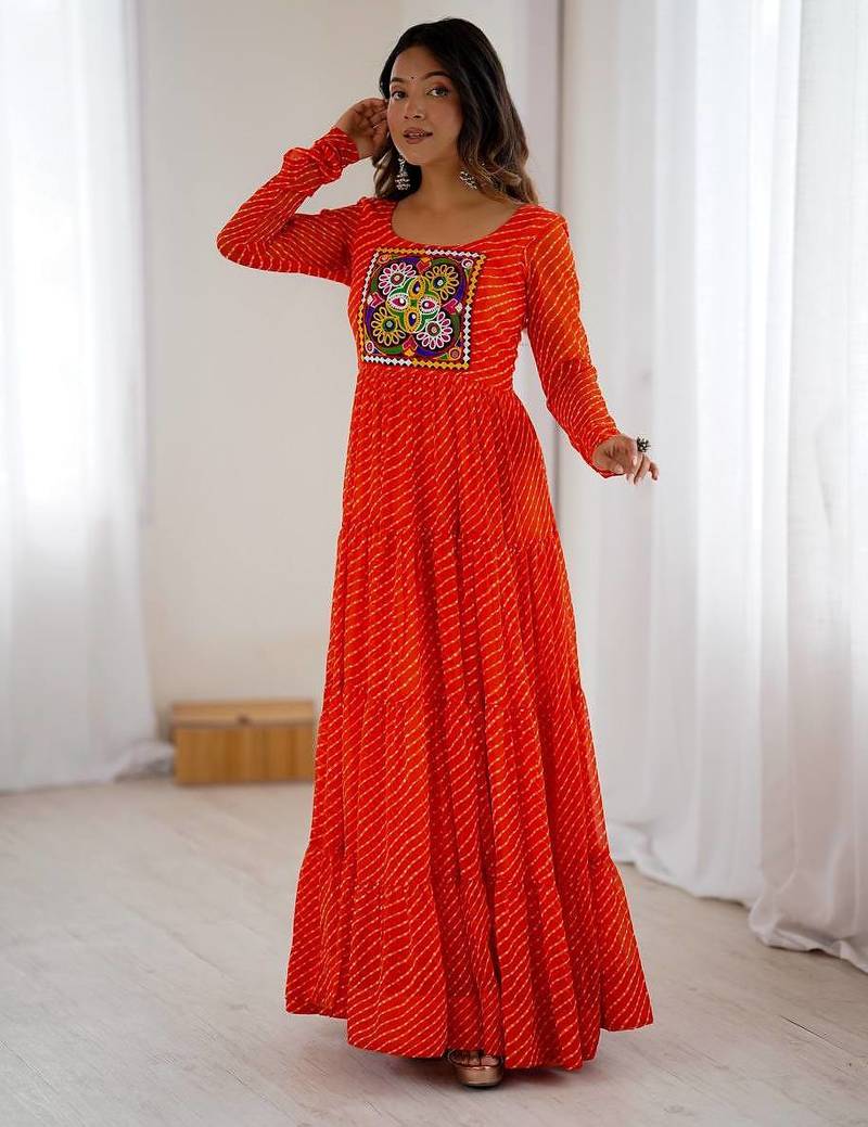 • Product Id : 4708089 • Package Details : 1 Top • Type : Anarkali Suit • Region : India • Type : Anarkali Suits • Look : Fashion • Sleeve : Full Sleeve • Neck Style : Round Neck • Occasion : Navratri • Color : Orange • Fabric : Faux Georgette • Work : Fancy • Stitching : Stitched Payments [+]