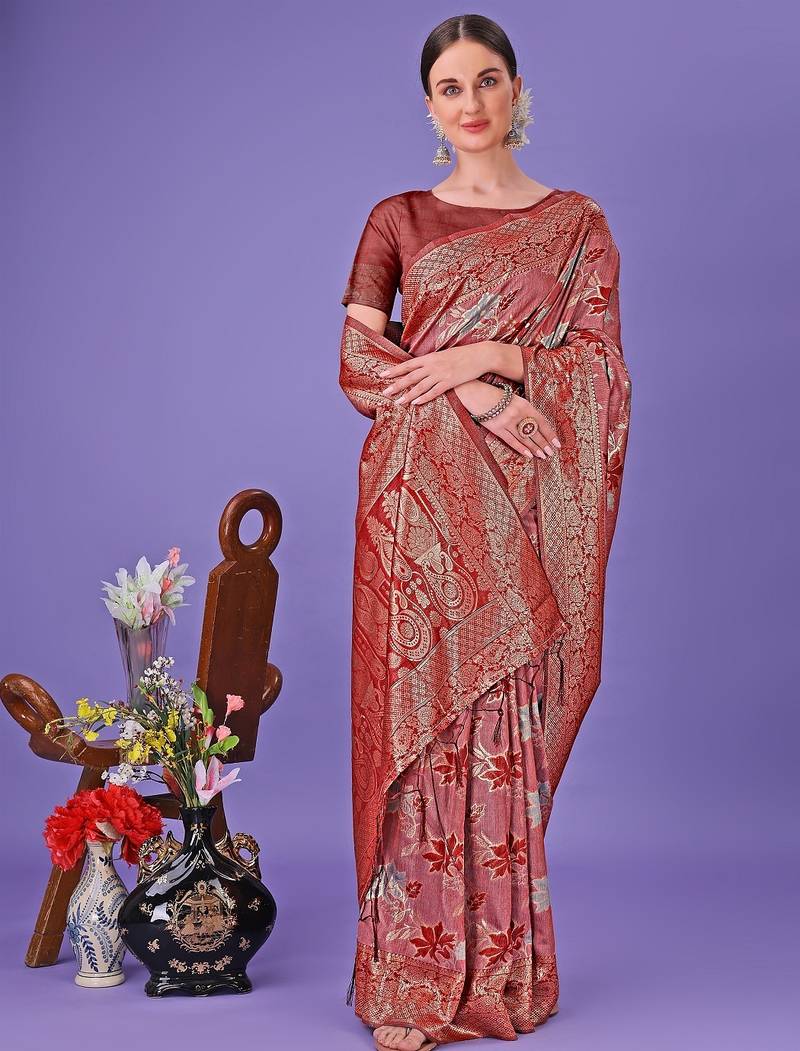 Red Color Woven Cotton Saree With Blouse