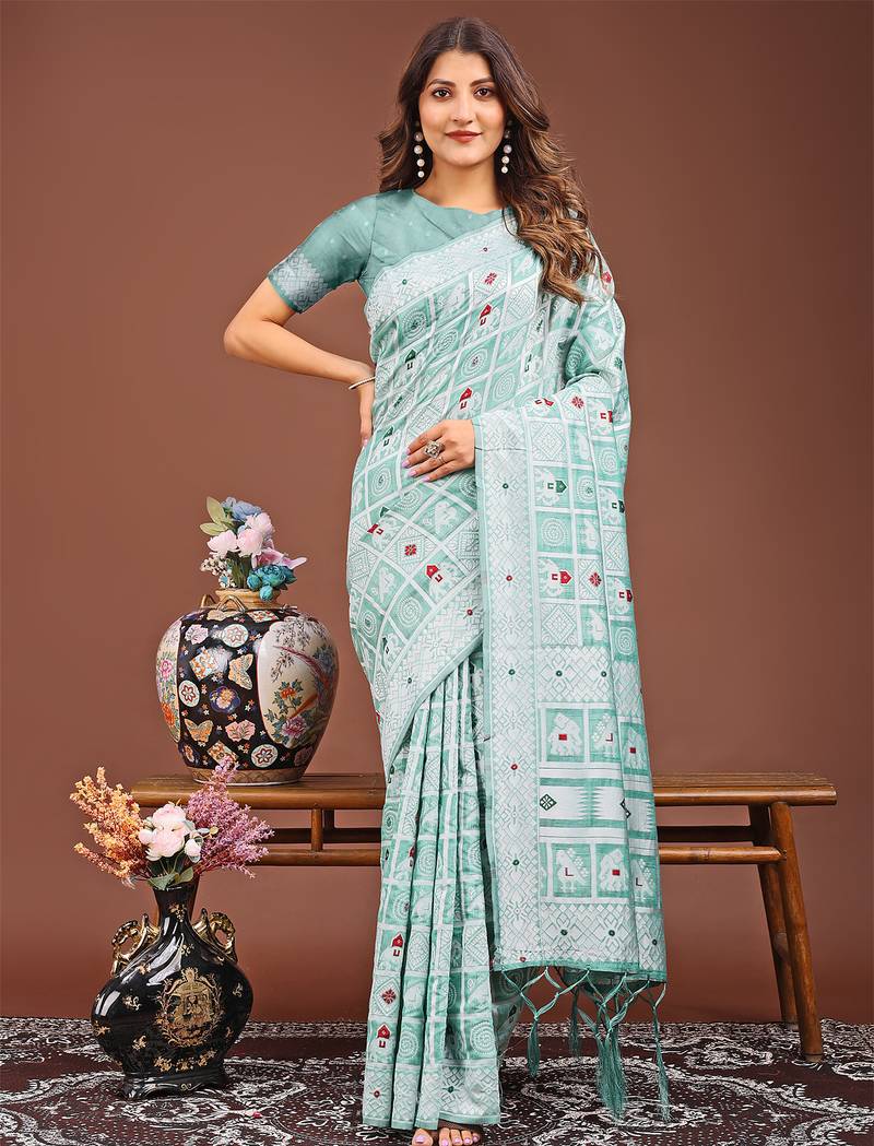 linen cotton silk woven work women's beautiful indian party wear festival saree with un-stitched blouse