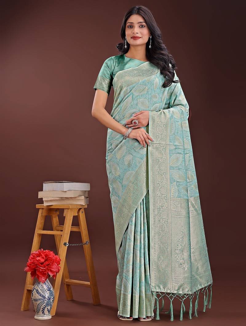 Sea Green Color Woven Work Cotton Saree With Blouse